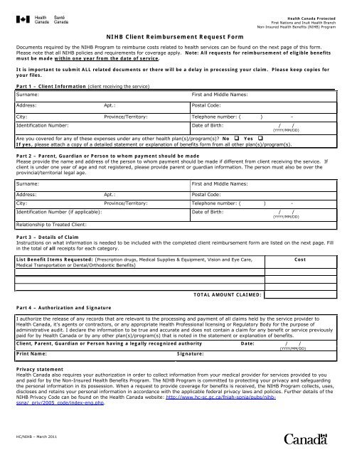 Non insured health benefits nihb program hc nihb august 2011 nihb client reimbursement request form.
