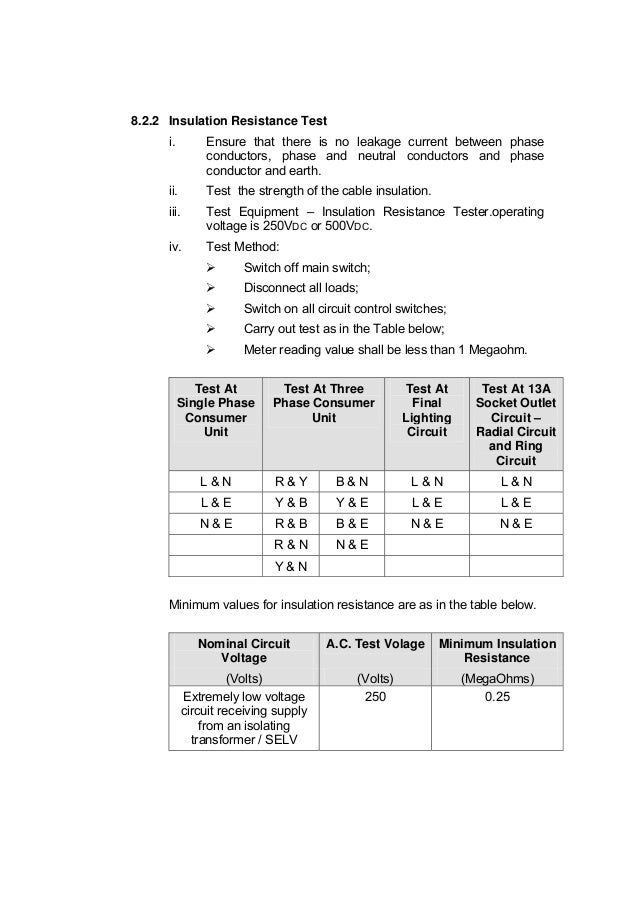 Minimum insulation resistance test results.